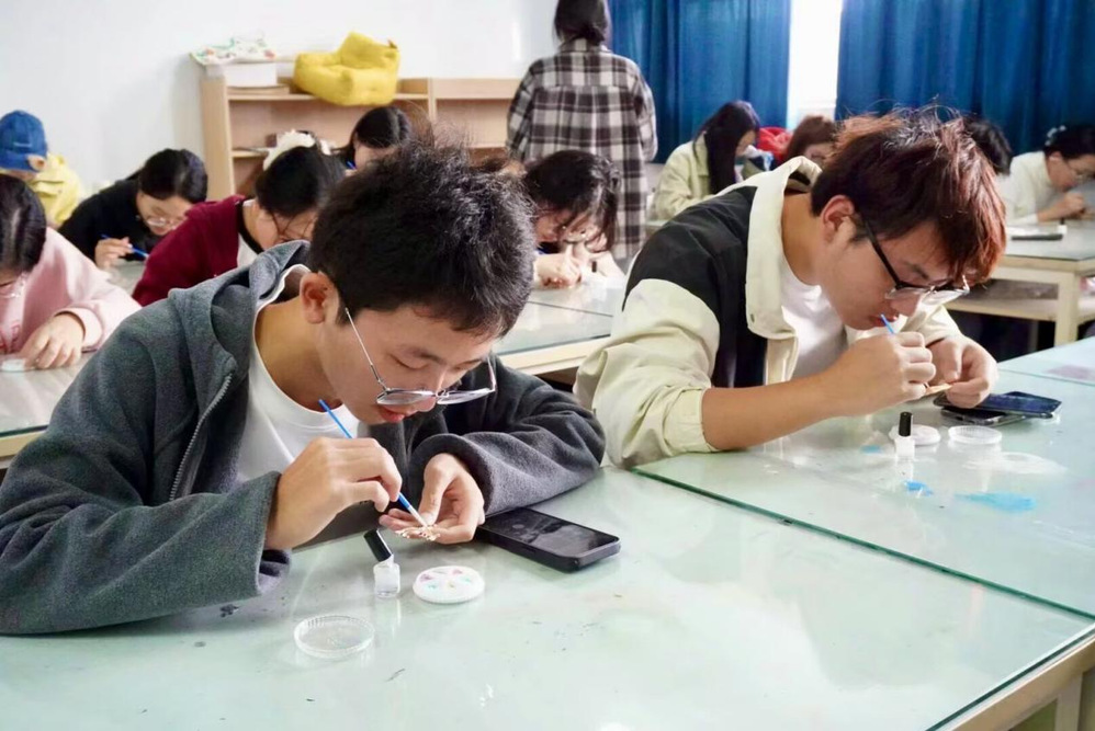 制作环节正式开始后,同学们充分发挥创意,自由搭配七彩螺钿。遇到难题时,大家还会互相交流技巧,分享设计思路。现场不时传来“这个配色好有国风的感觉”、“我做完要送给我奶奶”的讨论声,每个人都在专注中享受着手工创作的治愈与快乐。