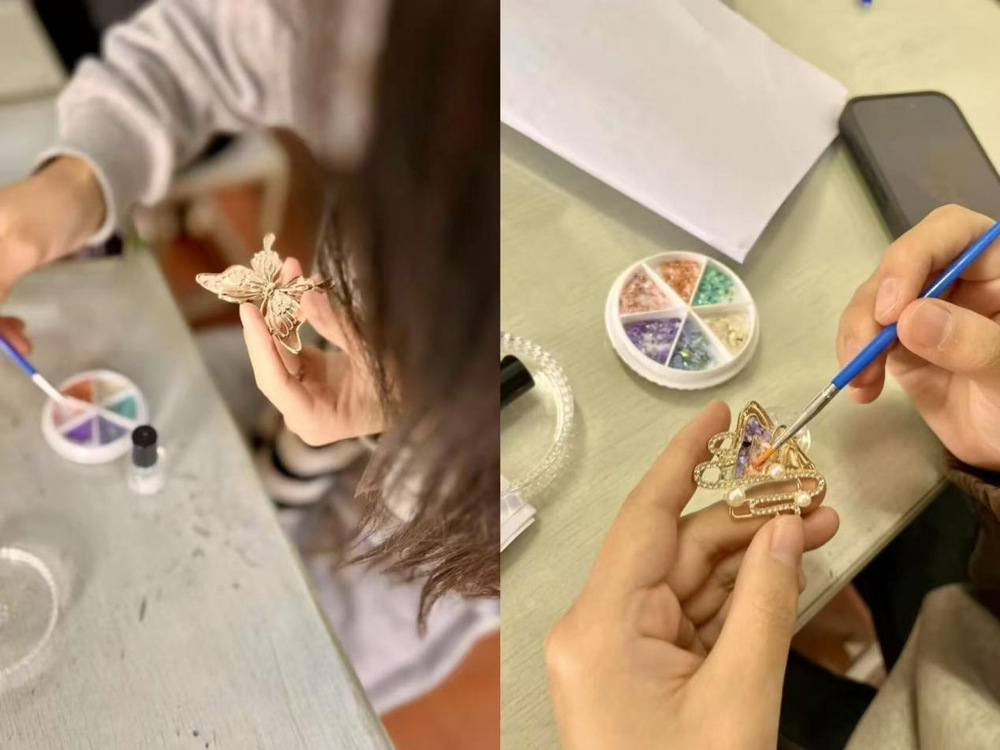 活动当天,现场秩序井然。工作人员早早到位,将分装整齐的材料包一一分发给到场同学,并播放制作教程视频。拿到材料包的同学们,迫不及待地打开查看,指尖触碰着金属底托与彩色螺钿配件,眼中满是对制作的期待,现场轻松愉悦的氛围瞬间拉满。