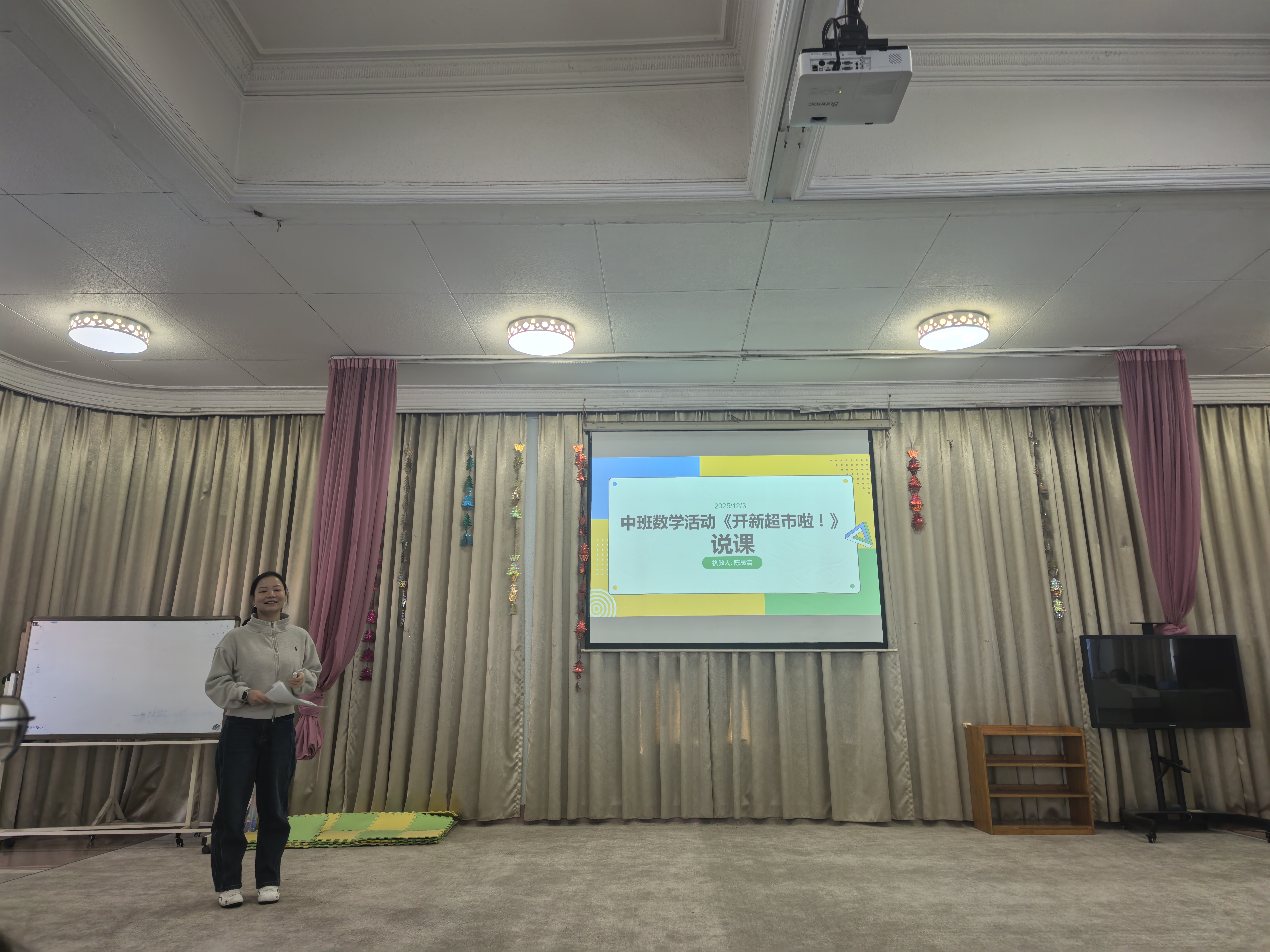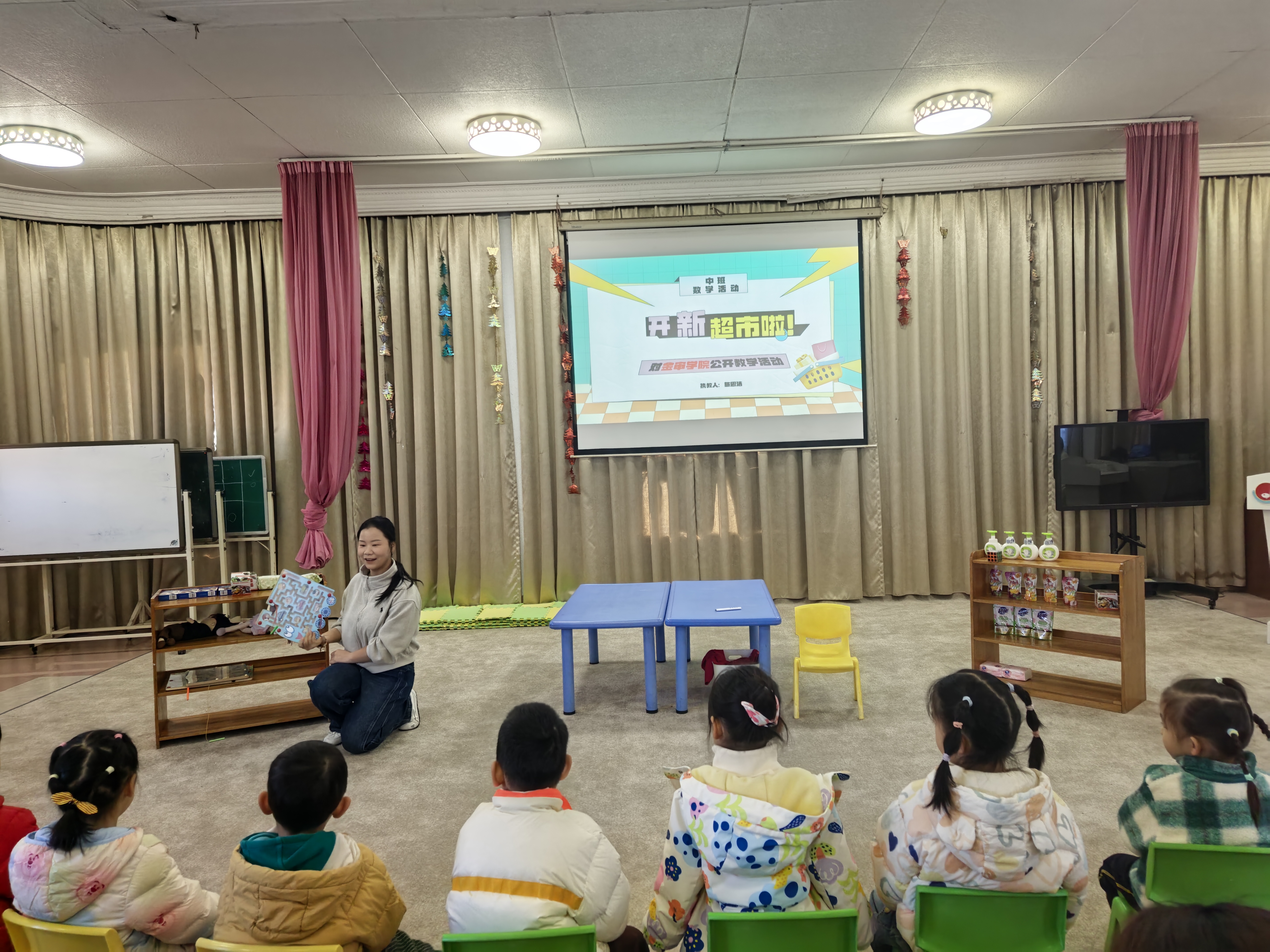 首先,陈思洁老师执教的中班活动《开新超市啦》。以筹备超市开业为主线,引导幼儿通过“分类摆放—有序摆放—价格标签制作”三次操作性,体验了按用途分类与符号表征,感受数学在生活中的运用。