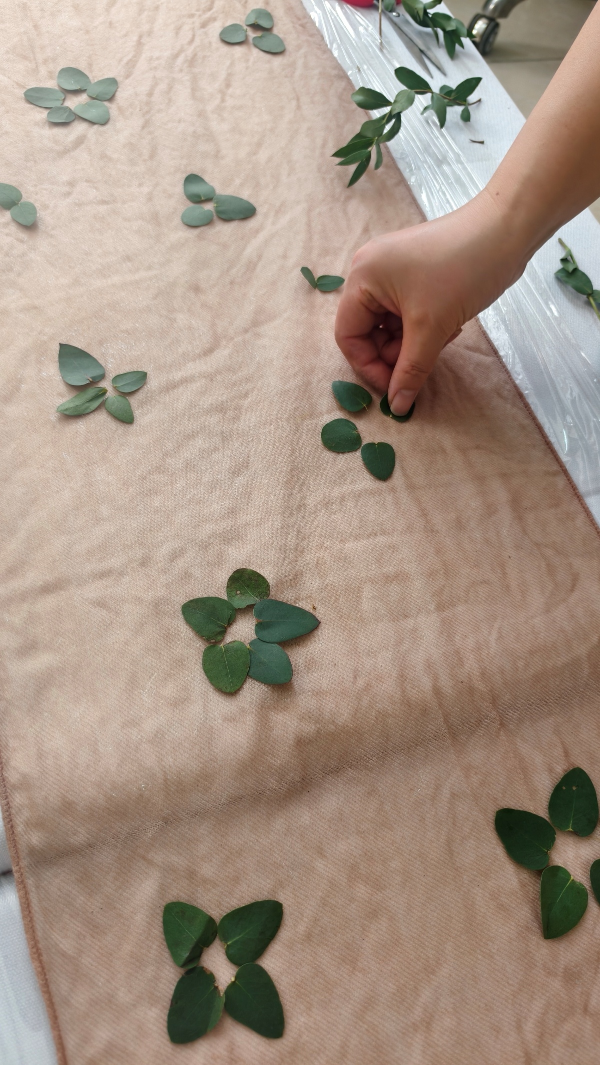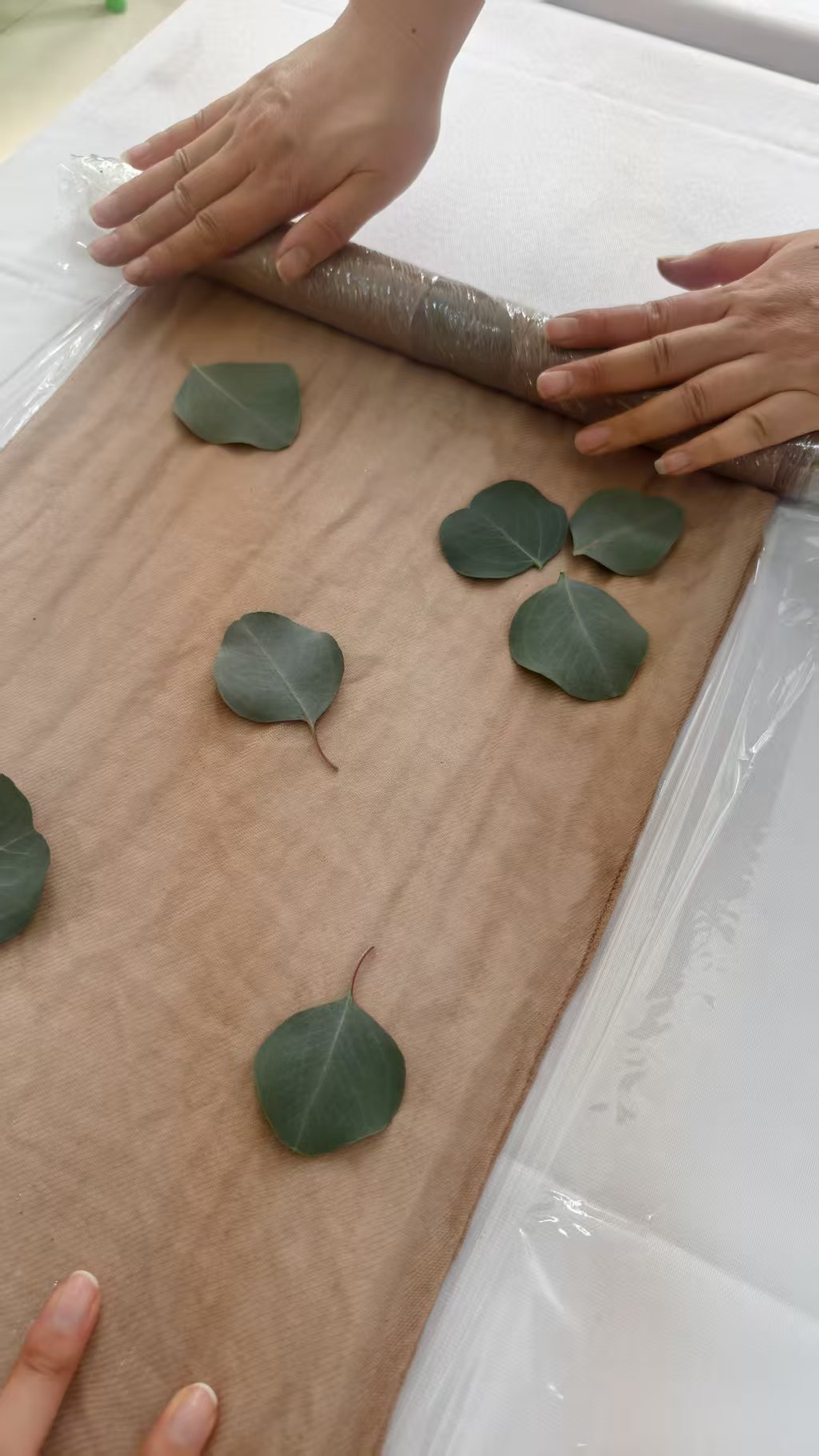 染色完成后,活动进入更具创意与诗意的环节——植物拓染。同学们走出工作室,在校园中精心捡拾形状各异的落叶,将其巧妙排列在染好底色的围巾上,通过固定、蒸煮等传统工艺,将叶片的轮廓与脉络永恒定格于织物之上。每一片叶子都成为独特的自然印章,构成一幅幅充满随机美感与校园记忆的冬日画卷。
