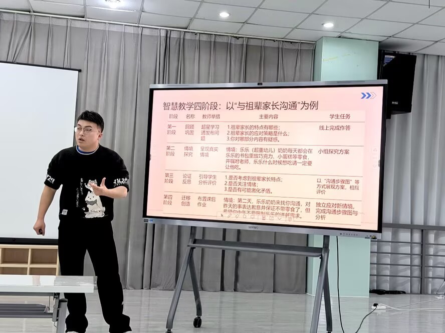 活动伊始,张老师剖析了传统学前教育教学模式固化、实践培养不足、内容更新滞后等问题,探讨了AI为教学带来的自适应知识传授、具身化实践培养的价值,也客观分析了其在知识体系搭建、课堂节奏把控等方面的短板。活动中张老师还结合布鲁姆认知目标,制定了回顾巩固、情境探究、论证反思、迁移创造的智慧教学四阶段实施框架,并以《幼儿园教师家长工作指导》课程中的“祖辈家长的特点与沟通策略”为典型案例,拆解了各阶段具体实操流程。