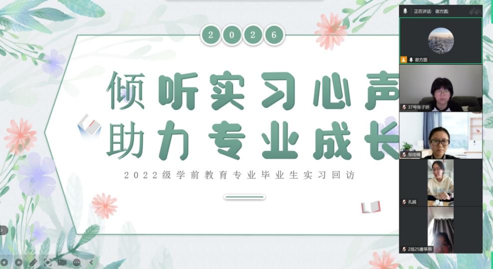 为深入了解学前教育专业学生在顶岗实习期间的实践成效,近日,我院学前教育专业指导教师开展学生实习回访工作。专业教师团队通过视频会议平台,与正在多所幼儿园或教育机构进行岗位实习的学生们“云端”相聚,重点围绕“幼儿园一日生活中的师幼互动”展开深度交流与研讨。